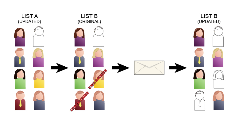 So far, no problem. Now you create a second list (List B) as a segment of List A, and two more people unsubscribe from it. Everything seems to be in order, but because you are no longer working from your List A, the unsubscribes are only reflected in List B. We have two more unsubscribes, and as long as you are working from List B, everything is fine.