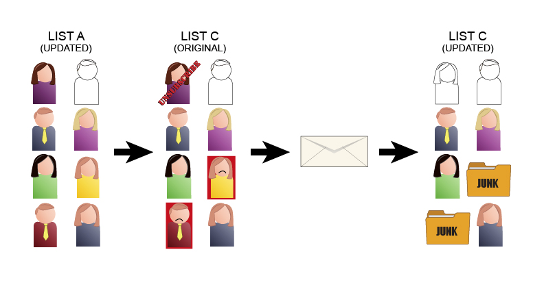 But if you go back to List A to create a new segment (List C), the two people who unsubscribed after the mailings from List B (outlined in red) are unpleasantly surprised to find they are back on your list. This time, they mark your email as Spam and all future email from you goes directly to the Junk Folder. In the meantime, another person has unsubscribed. Now you have three lists all with different unsubscribe information.