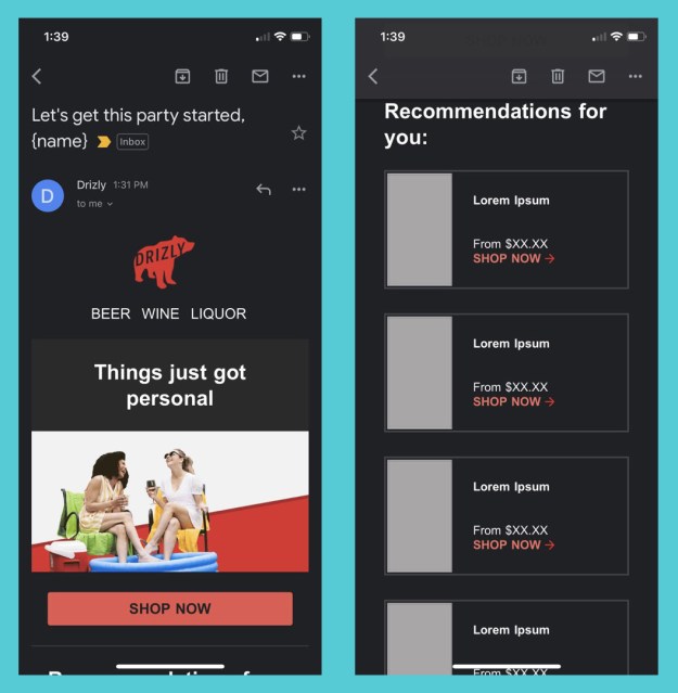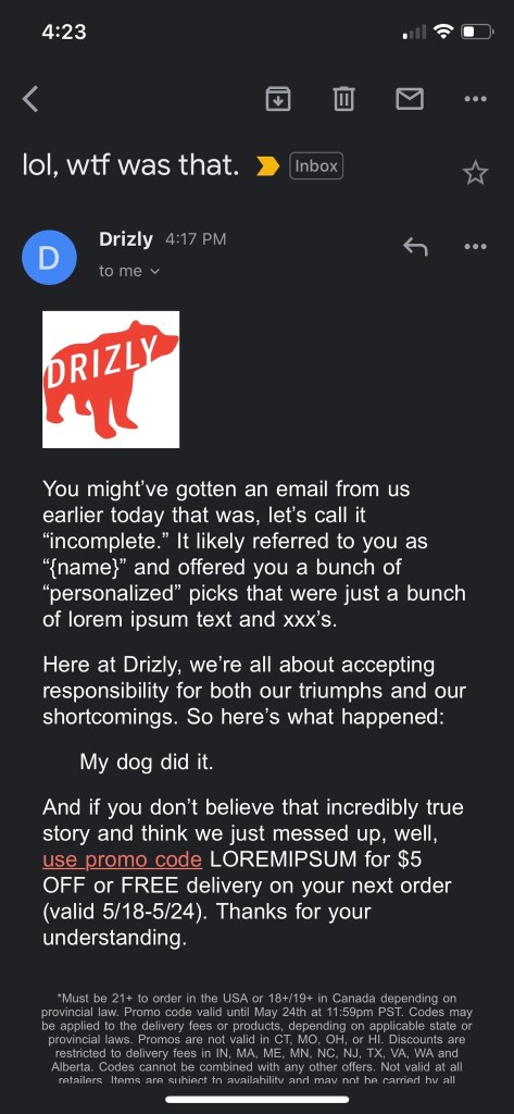 Using Lorem Ipsum text and other placeholders while designing a mailing can help get through the initial stages of email design, but when you forget it’s there, the results can be embarrassing. A case in point is what happened to Drzly back in May. Few businesses have fared better under the Covid restrictions than the liquor delivery services, and Drzly’s no exception. Perhaps that’s why they sent this email without testing it first, trying to capitalize on the moment. The mistakes are bad enough, but the banner line “Things just got personal” doesn’t help. This is as bad a mistake as we’ve ever seen, but Drzly’s response shows exactly what to do when this happens: