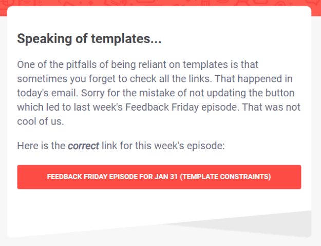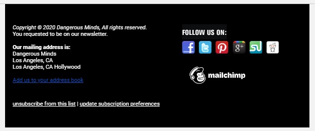 I don’t have to even say anything about this one. This apology email from Really Good Email actually says it all. It’s also worth noting that this is as true of a template you’ve been using for a while as it is for a new one. For instance, look at the footer on this mailing from Dangerous Minds: