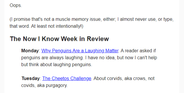 I wonder how many people were confused by the reference to covid. What the author meant was, of course, “corvid”—the family of birds known as crows. This one came from Dan Lewis, whose Now I Know newsletters are always filled with fun facts. One thing any of us who often work alone have learned is that you can’t proofread your own work. You need another set of eyes somewhere along the way. Dan quickly followed it up with a correction, but at the bottom of the page we see this: