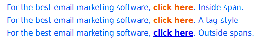 Not very useful. You can remove the underline by adding the style attribute “text-decoration: none,” but the text would still be blue. Just be careful that you haven’t assigned the text to appear in a color that is close to the default link color (which varies between browsers), email client systems aren’t smart enough to recognize the color of your text, and your links are likely to get lost.