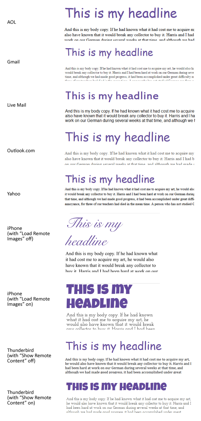 As you can see, only the iPhone and Thunderbird rendered it correctly. Even here the fonts are only displayed when “Load Remote Images” is turned on (the default setting for the iPhone, but not for Thunderbird). Because Web Fonts require a link to work, these fonts are treated the same as images. If an email client defaults to “Images Off,” it’s not going to display Web Fonts either, even if it can. No images, no fonts.