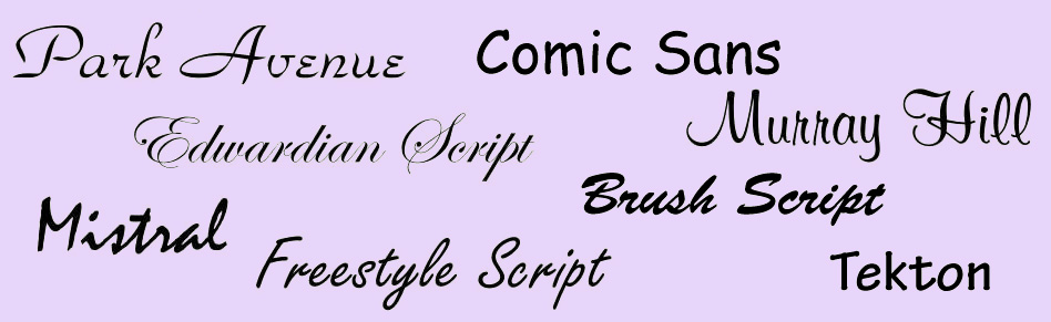 A Handwriting font, as the name suggests, is one that resembles handwritten text. These fonts are also referred to as “Cursive” or “Script” fonts. Sometimes these are fancy, such as Park Avenue and Edwardian Script, and sometimes they are more casual, such as Comic Sans and Freestyle Script. Caution should be used with these fonts. As you’ll see when we get to the Web Fonts, cursive fonts usually default to Comic Sans, which is often a poor substitution.